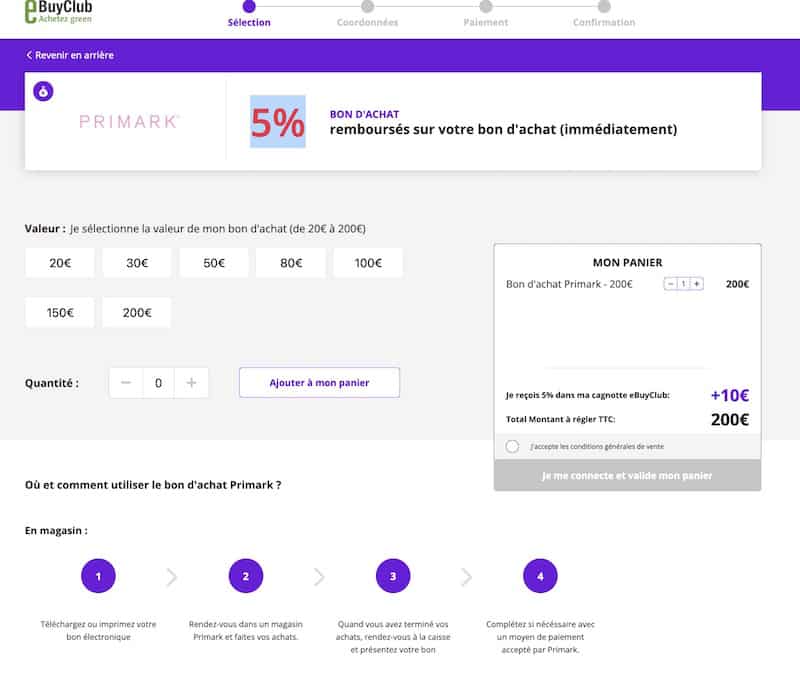 Il est possible d’offrir une carte cadeau Primark via le site internet de l’enseigne. Mais nous ne vous le recommandons pas, selon nous il vaut mieux acheter un bon d’achat Primark via l’offre carte cadeau Ebuyclub ce qui permet d’obtenir 5% de réduction sur l’achat de la valeur du bon d’achat qui sera directement déposé sur votre compte Ebuyclub. C’est vraiment l’astuce du moment que nous vous recommandons.